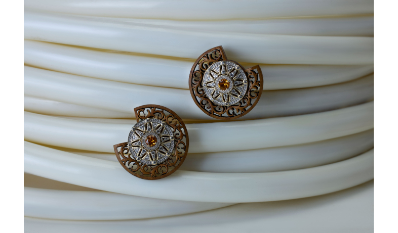 Inspired by the Konark Sun Temple, the stylised spherical earrings employ wood, gold, natural white sapphires, and citrine.