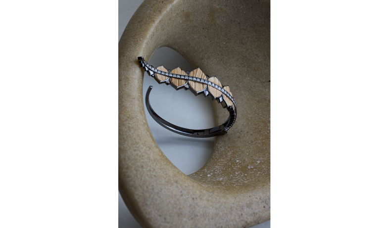 The curvaceous black gold bracelet is designed with areca palm leaves and studded with diamonds.