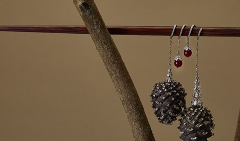 Made from pinecone wood, the hair accessory features two pinecones looped with 22-karat gold diamond-studded cords of varying lengths.