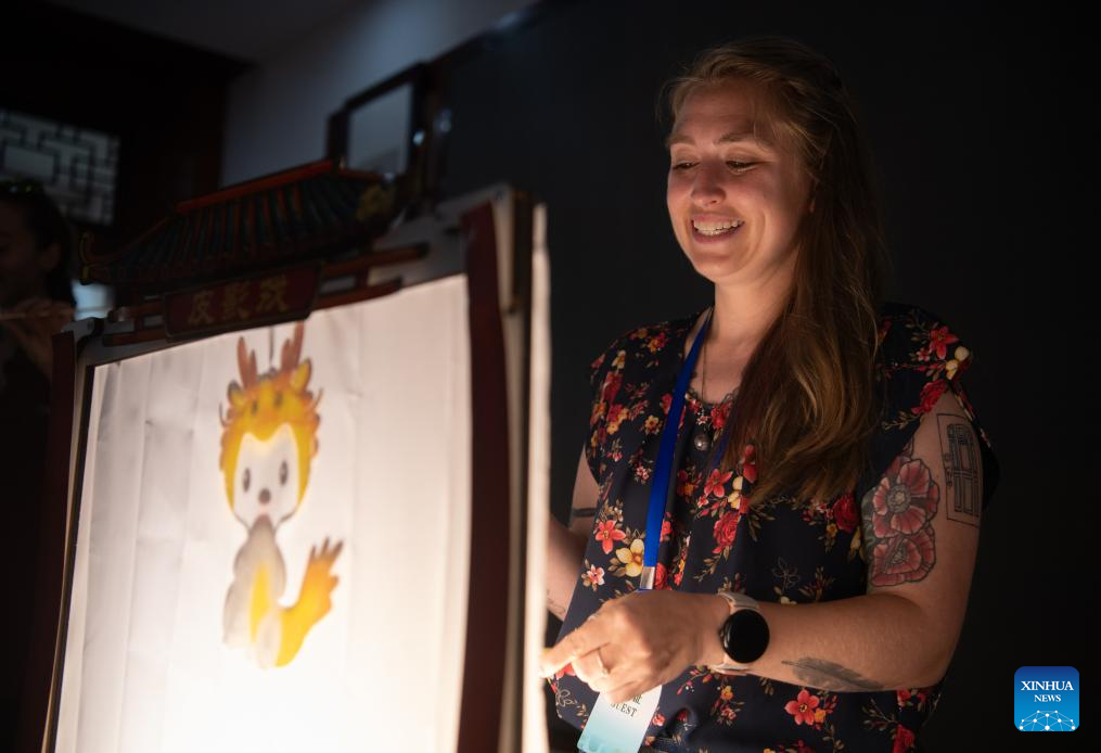 A young American experiences shadow play at Wuhan Conservatory of Music in Wuhan, central China’s Hubei Province, June 8, 2024.(Xinhua/Du Zixuan)