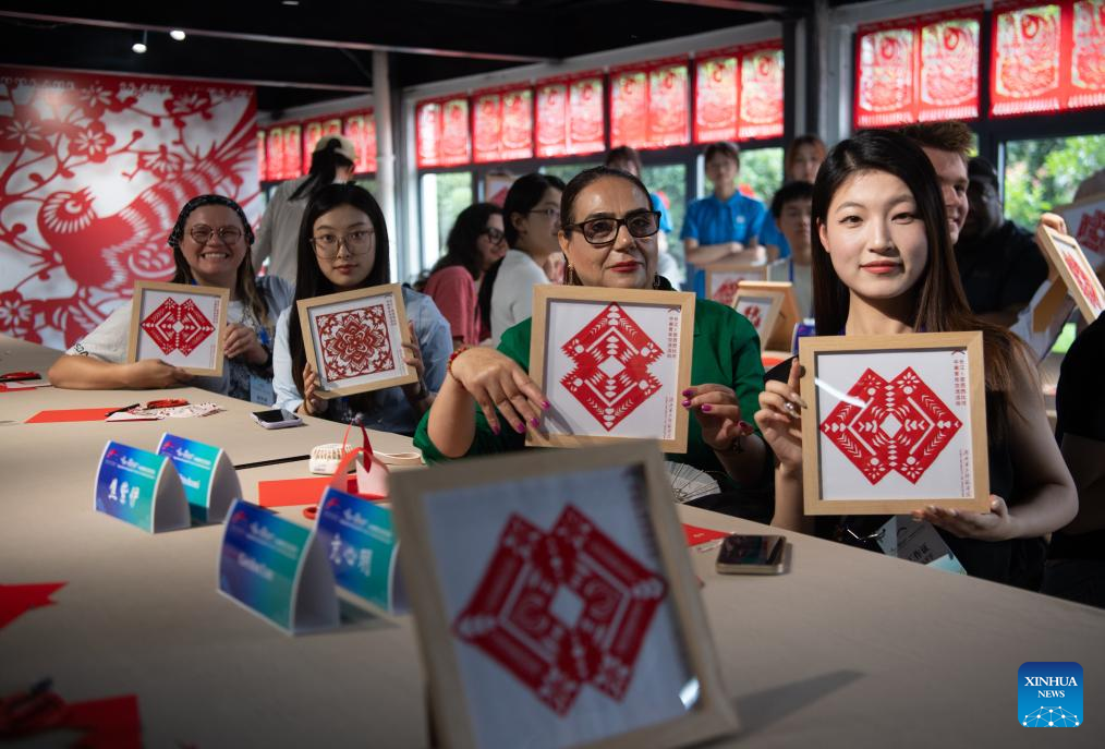 Participants taking part in a China-U.S. youth exchange program display paper-cut works at Hubei University of Education in Wuhan, central China’s Hubei Province, June 8, 2024.(Xinhua/Du Zixuan)