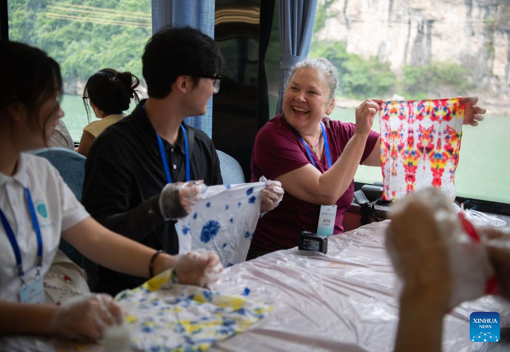 Participants taking part in a China-U.S. youth exchange program experience tie-dye on board an electric tourist ship in Yichang, central China’s Hubei Province, June 11, 2024.(Xinhua/Du Zixuan)