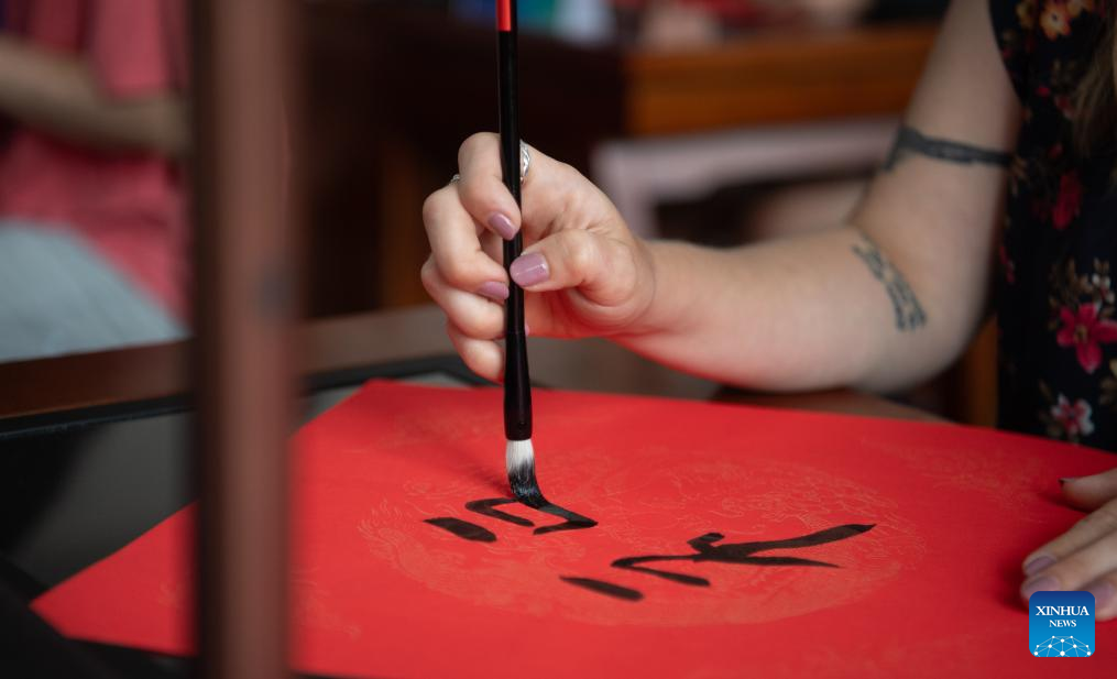 A young American experiences Chinese calligraphy at Hubei University of Education in Wuhan, central China’s Hubei Province, June 8, 2024.(Xinhua/Du Zixuan)