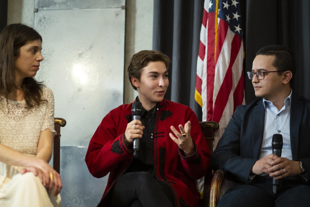 Lea Jouannais Weiler (pictured in the centre) from Yale University speaks during the US Goncourt Prize Selection Ceremony at Albertine Books in New York City. Source: AFP