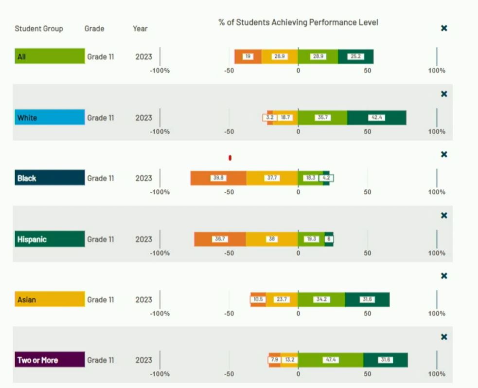 In math, 88% of Black students, 81% of Hispanic students, 95% of English learners, 86% of low-income students, 90% of students with an IEP and 34% of white students partially met or approached state standards, the two lowest categories.