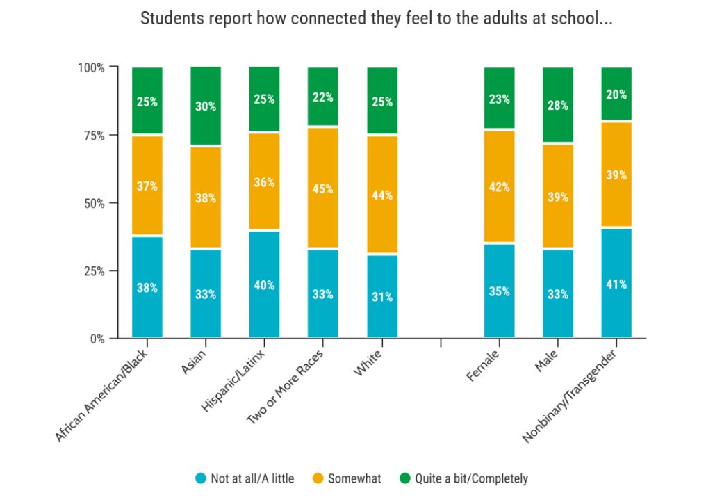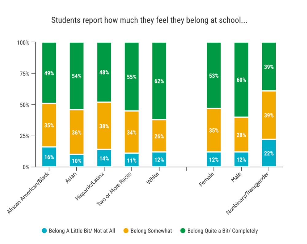 Nonbinary and transgender students reported the lowest sense of belonging and connectedness across all three categories, with 39% saying they belong quite a bit or completely.