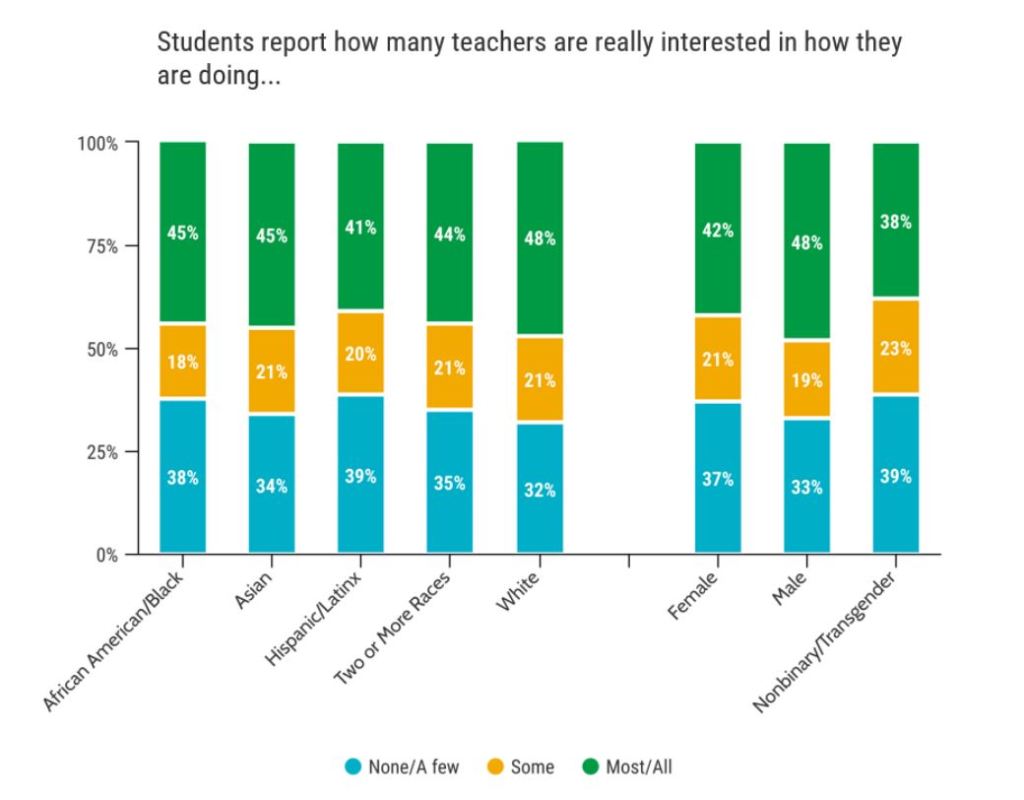 As shown below, on the spring 2023 wellbeing survey completed by 80% of the student population, 56% of all students reported feeling like they belong quite a bit or completely at ETHS, 25% reported feeling quite a bit or completely connected to the adults at school and 45% said most or all of their teachers are really interested in how they’re doing.