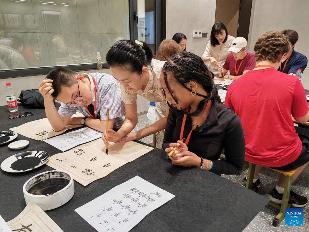 Chinese calligraphy teacher Fan Le (2nd L) demonstrates for Nasra Hassan Farah (3rd L) from Valley High School during her calligraphy practice at Shijiazhuang Foreign Language School in Shijiazhuang, north China’s Hebei Province, June 8, 2024. (Xinhua/Du Yifang)
