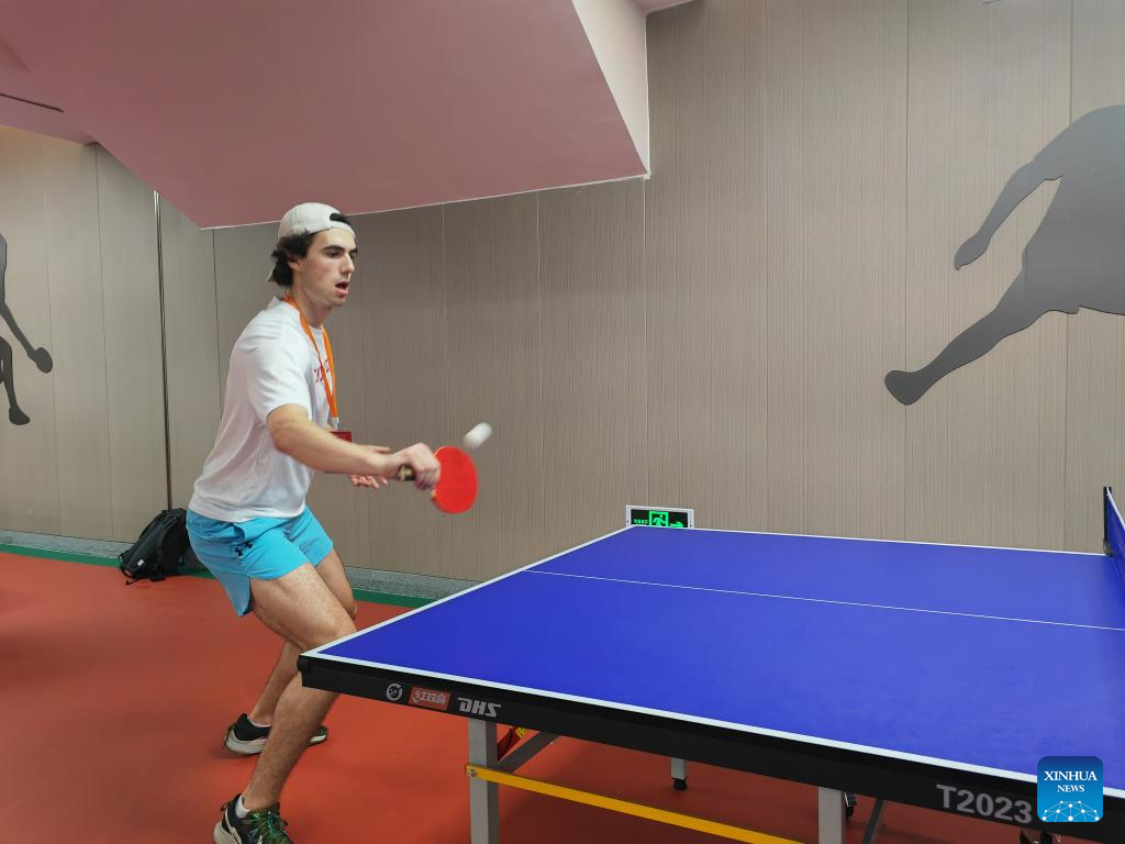 Brody Tate Clarke from Iowa City High School takes a table tennis class at Shijiazhuang Foreign Language School in Shijiazhuang, north China’s Hebei Province, June 8, 2024. (Xinhua/Du Yifang)