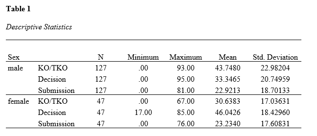 As shown in Table 1, male athletes who won were as follows: by KO/TKO: 43.75%±22.98; Decision: 33.35%±20.75; and Submission: 22.92%±18.70. Female athletes who won were as follows: by KO/TKO: 30.64%±17.04; Decision: 46.04%±18:43; and Submission: 23.23%±17.61.
