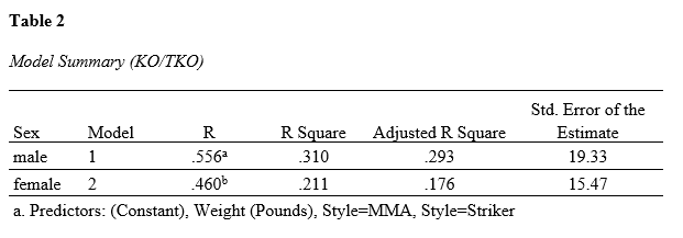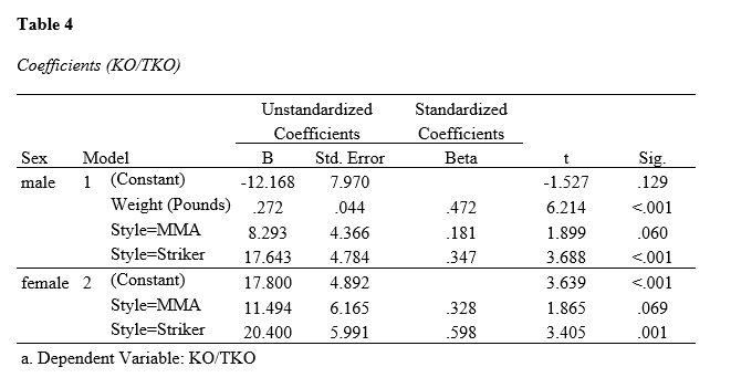 According to the findings, male athletes’ KO/TKO wins are predicted by weight and fighting styles (MMA and Striker), while female athletes’ KO/TKO wins are only predicted by fighting styles (MMA and Striker). For male athletes, the regression equation is thus: Ŷ = -12.168 + 0.272X1 + 8.293X2 + 17.643X3. For female athletes, the regression equation is Ŷ = 17.8 + 11.494X1 + 20.4X2. For male athletes, the results indicate that the higher the athlete’s weight class, the more likely they are to win by KO/TKO. Additionally, for both male and female athletes, MMA and Striker styles rely more on their technical specialties to win fights, i.e. they are more likely to win by KO/TKO than Grapplers.