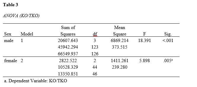 Table 10 shows the test of regression coefficients. The results showed that weight and fighting styles (MMA and Striker) are predictors of Submission wins for male and female athletes. For male athletes, the regression equation is thus: Ŷ = 46.947 – 0.9X1 – 10.802X2 – 11.838X3. For female athletes, the regression equation is: Ŷ = 121.901- 0.657X1 – 17.325X2 – 23.972X3.