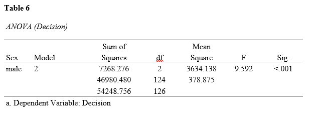 Table 5 shows statistical tests for the regression model. For male athletes, the correlation coefficient was R=0.366, R2=0.134, adjusted R2=0.12, and the estimated standard error was 19.46. For female athletes, there were no effective predictors for the dependent variable.