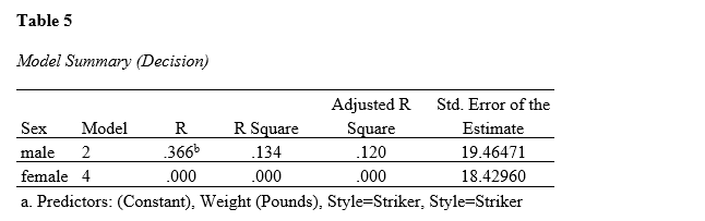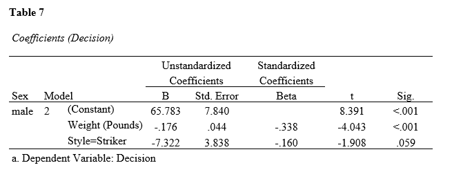 Table 7 shows the test for regression coefficients for male athletes. Results showed that weight and striker style are the predictors of the dependent variable. The regression equation is thus: Ŷ = 65.783 – 0.176X1 – 7.322X2.