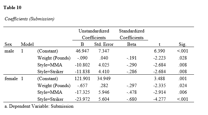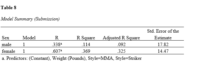 The findings indicate that weight and fighting styles (MMA and Striker) can be utilized as predictors of Submission wins for both male and female athletes. For male athletes, the regression equation is thus: Ŷ = 46.947 – 0.9X1 – 10.802X2 – 11.838X3. For female athletes, the regression equation is Ŷ = 121.901 – 0.657X1 – 17.325X2 – 23.972X3. Results showed that negative relationship between these independent variables and dependent variables. The findings indicated that Grapplers are more likely to win the fights through Submission, and MMA and Striker styles were negatively associated with Submission wins.