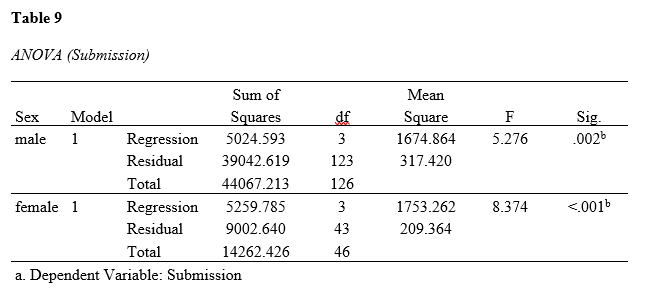 Table 8 shows statistical tests for the regression model. For male athletes, the correlation coefficient was R=0.338, R2=0.114, adjusted R2=0.092, and the estimated standard error was 17.82. For female athletes, the correlation coefficient was R=0.607, R2=0.369, adjusted R2=0.325, and the estimated standard error was 14.47.