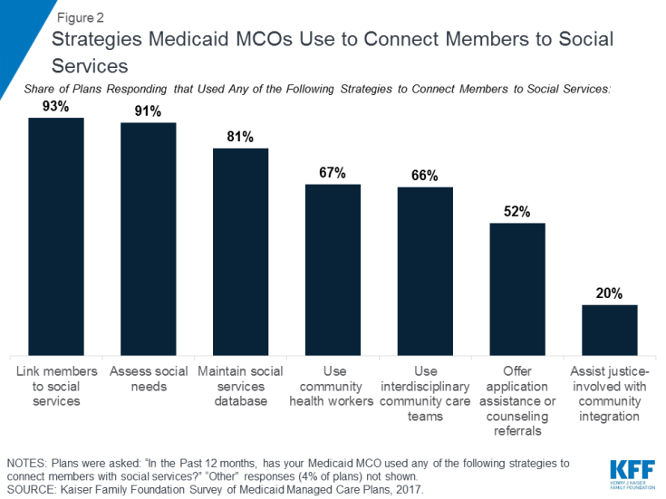 Medicaid MCOs are increasingly engaging in activities to address social determinants of health. Data from the Kaiser Family Foundation’s 50-state Medicaid budget survey show that a growing number of states are requiring Medicaid MCOs to address social determinants of health as part of their contractual agreements (Box 1). In 2017, 19 states required Medicaid MCOs to screen beneficiaries for social needs and/or provide enrollees with referrals to social services and six states required MCOs to provide care coordination services to enrollees moving out of incarceration, with additional states planning to implement such requirements in 2018. Other data from a 2017 Kaiser Family Foundation survey of Medicaid managed care plans show that almost all responding MCOs (91%) reported activities to address social determinants of health, with housing and nutrition/food security as the top areas of focus. The most common activities plans reported engaging in were working with community -based organizations to link members to social services (93%), assessing members’ social needs (91%), and maintaining community or social service resource databases (81%) (Figure 2). Some plans also reported using community health workers (67%), using interdisciplinary community care teams (66%), offering application assistance and counseling referrals for social services (52%), and assisting justice-involved individuals with community reintegration (20%).