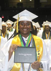 Joi Turner, a senior at Miami Killian Senior High School poses with her diploma at a commencement ceremony on Monday.