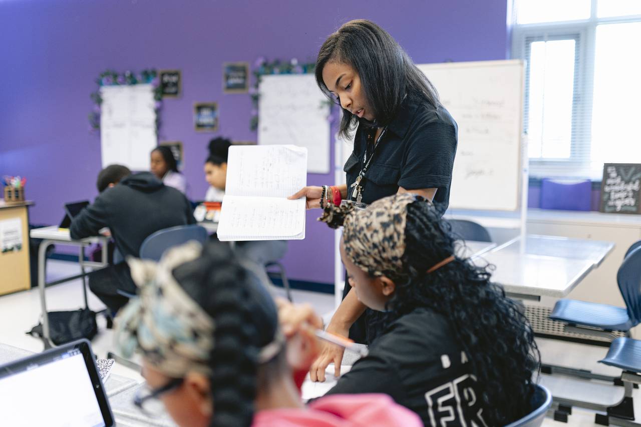 The school has had success retaining Black educators. The small staff looks markedly different today compared to when Principal Jenifer Rayne got there. About a quarter of the nearly 40 teachers are people of color; six years ago, 95% were white.