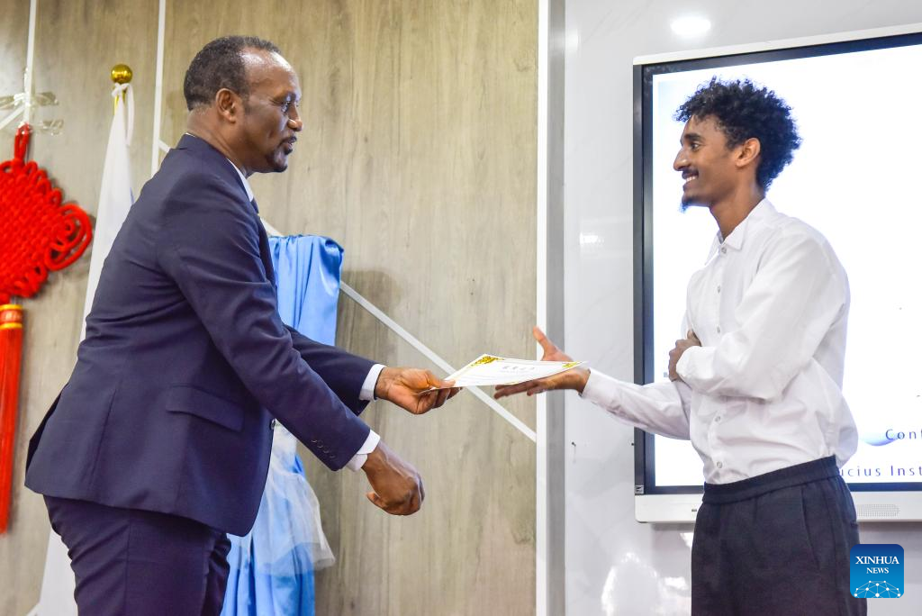 Ethiopia’s State Minister of Education Kora Tushune (L) presents a certificate to a contestant after the “Chinese Bridge” Chinese Proficiency Competition for Ethiopian college students in Addis Ababa, Ethiopia, on June 5, 2024. The “Chinese Bridge” Chinese Proficiency Competition for Ethiopian college students was held here on Wednesday. (Xinhua/Michael Tewelde)