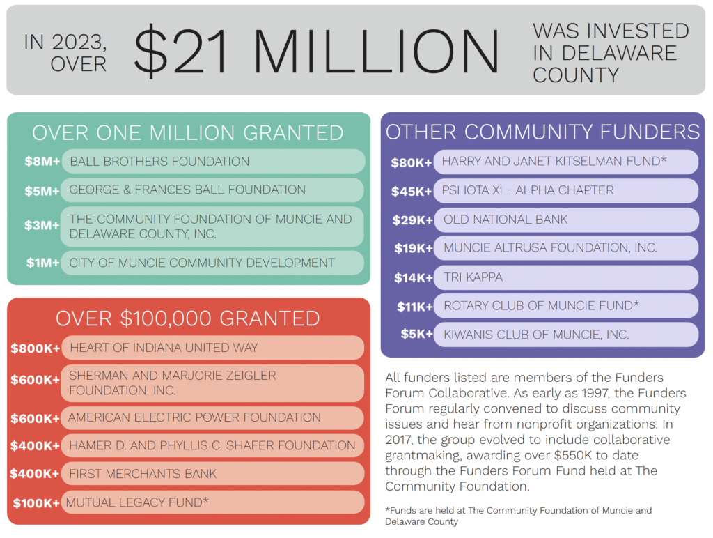 The Community Foundation, as convener of The Funders Forum Collaborative, has put together a Philanthropic Snapshot to share the extensive list of community funders and their grantmaking in 2023. The snapshot highlights the impact of the 17 members of the Funders Forum. It is exciting to see the collective investments of these organizationsin Muncie and Delaware County last year.
