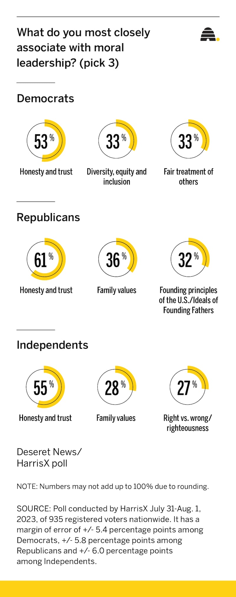 In a new national poll conducted by HarrisX for the Deseret News, after honesty Republicans and independents chose family values next, while Democrats’ second choice was a tie between diversity, equity and inclusion and fair treatment of others.