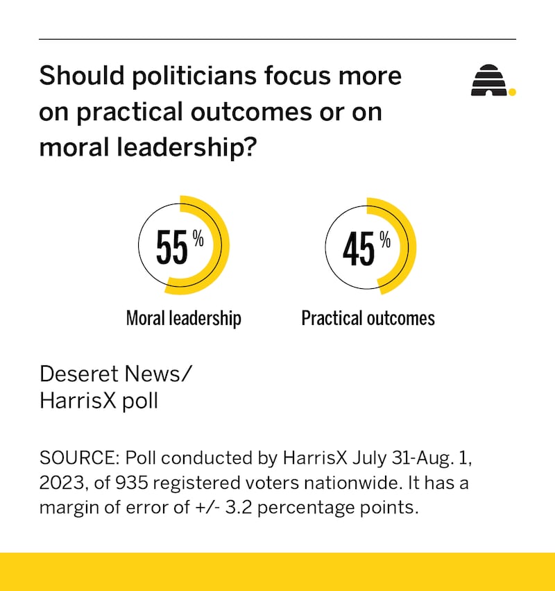 That comes through in the Deseret News/HarrisX poll. When asked whether politicians should focus more on moral leadership or practical outcomes, 55% of voters chose moral leadership, while 45% opted for practical outcomes.