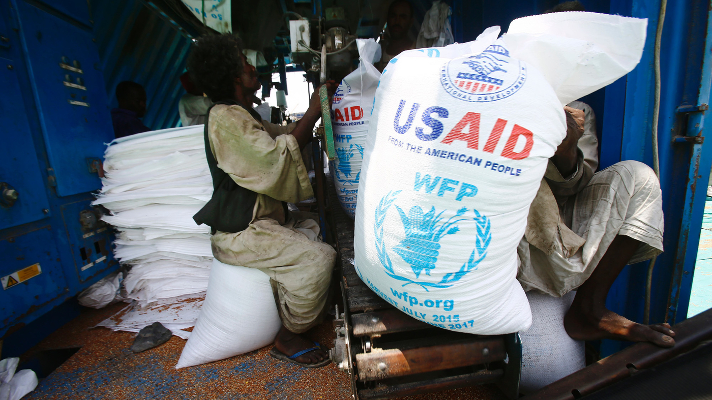 Sudanese dockers unload a U.S. aid shipment at Port Sudan on the Red Sea coast on May 5.