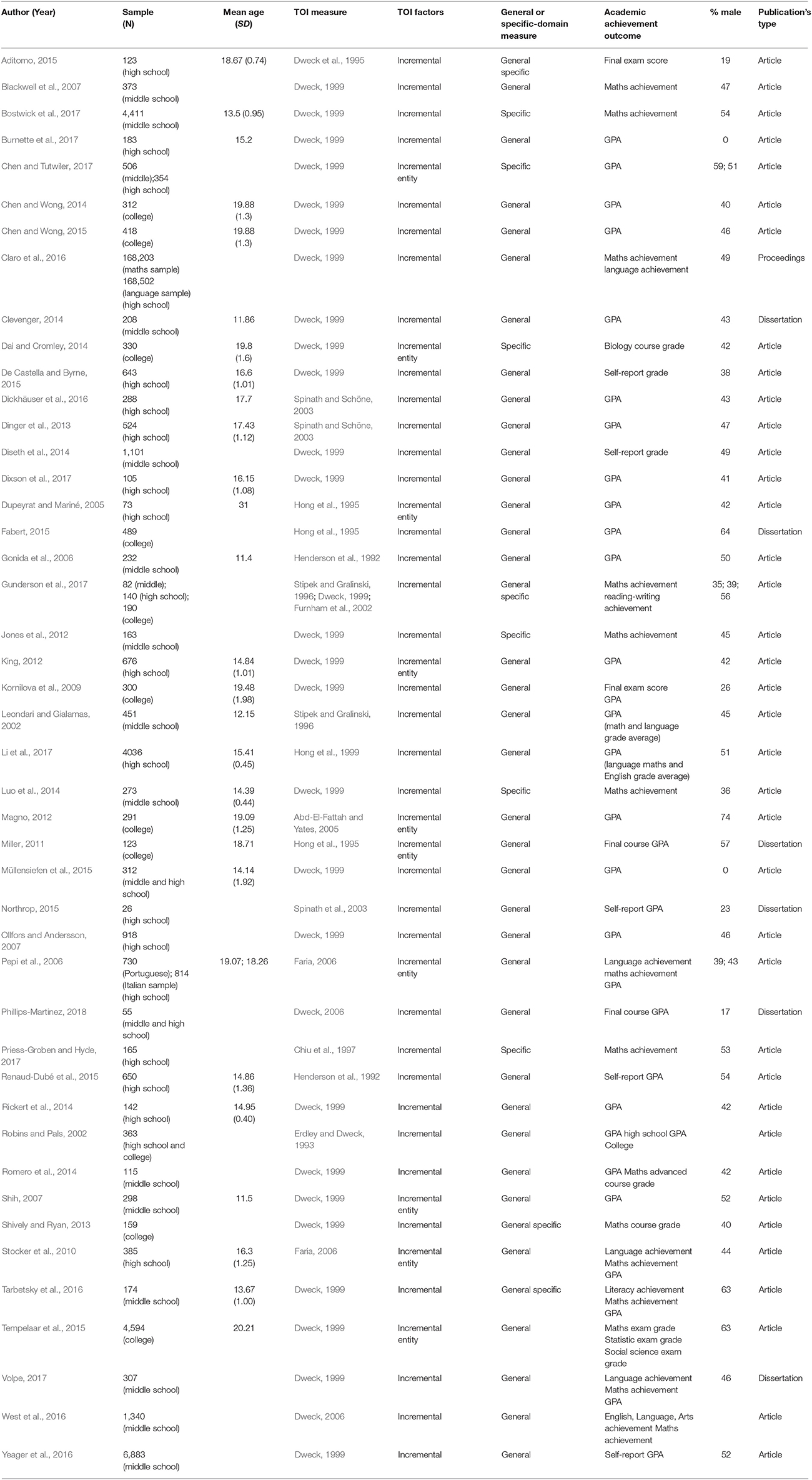 The outcome academic achievement considered students’ academic grades in different subjects. The studies in the final sample reported different academic achievement outcomes. When studies reported more than one outcome of interest, all relevant data from each study sample were extracted. Then, the authors classified outcomes into broad constructs and, subsequently, conducted separate meta-analyses for each of these constructs. All of the dependent variables reported the correlation coefficient with ITI, incremental and/or entity.