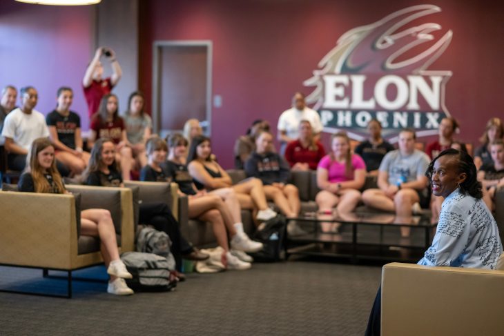 She recounted to a room full of more than 100 participants in Elon’s inaugural Women of Elon Weekend on Friday, March 15, that she like other top athletes was feeling invincible and tough leading up to that moment, but that even the toughest shed tears of appreciation during such a meaningful milestone.