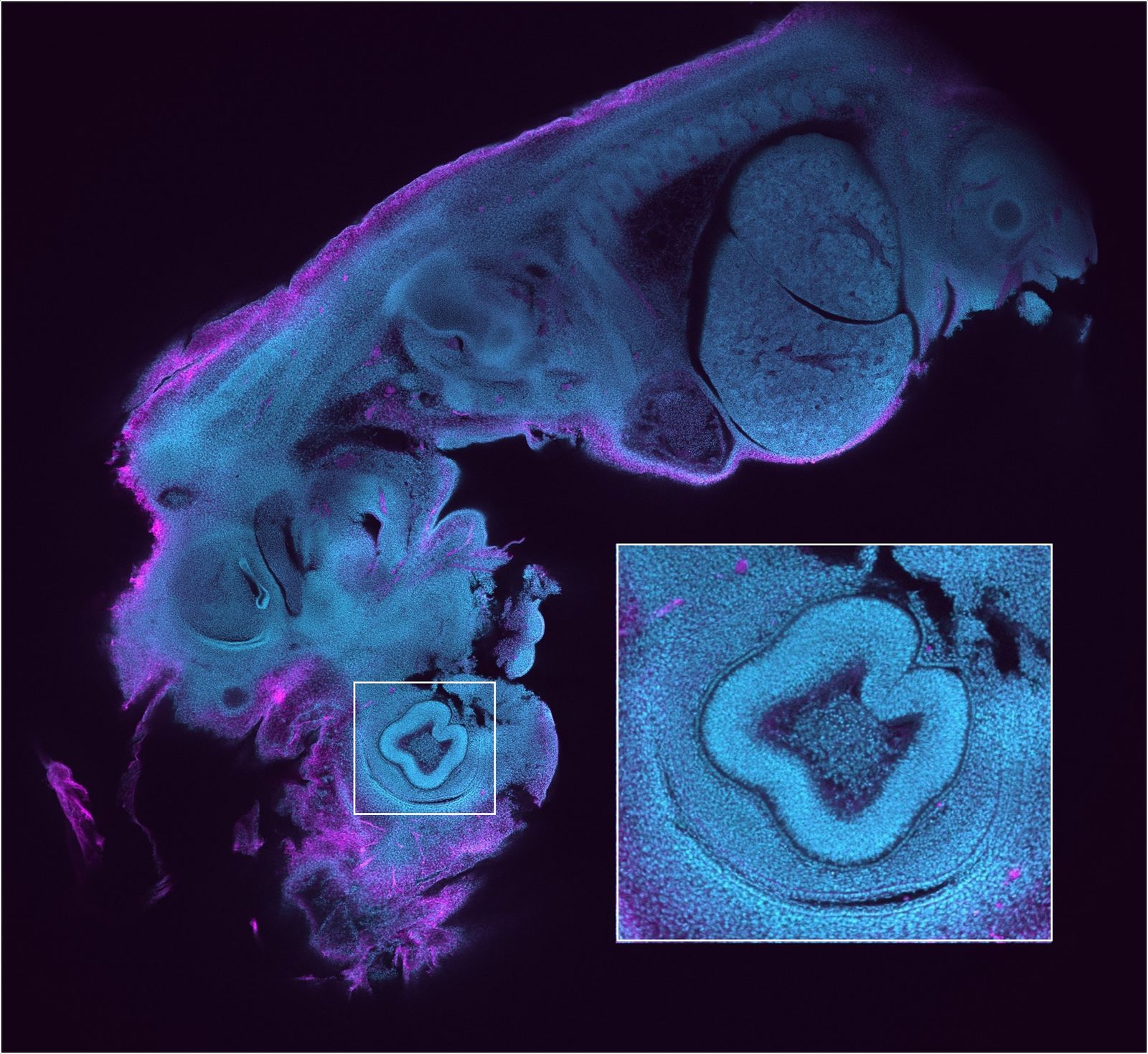 The image shows a 6 mm long, 12.5 day old mouse embryo obtained with the Mesolens. The inset shows a blow-up of the eye region revealing the individual cell nuclei. It is possible to identify fine structures throughout the embryo such as the developing heart muscle fibers and fine details in the eye such as the corneal endothelium using the Mesolens.