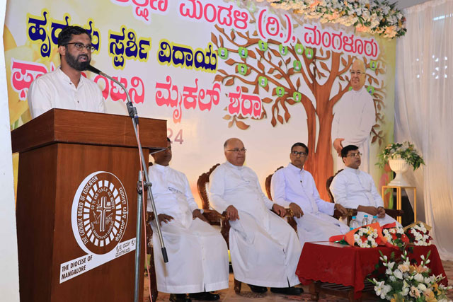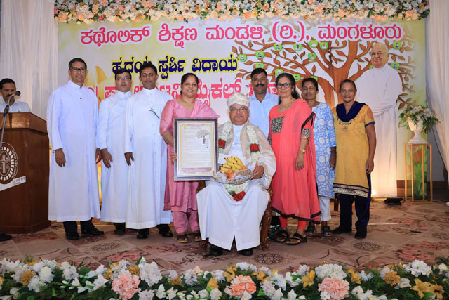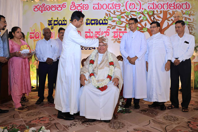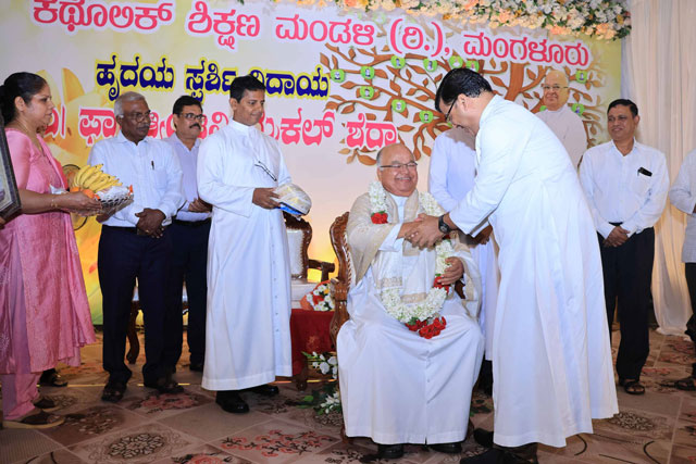 Dr Antony Prakash Monteiro, principal of St Philomena College Puttur, delivered words of felicitation for Fr Shera, while Aloysius D’Souza, headmaster of St Aloysius English Medium School, Urwa, read the scroll of honour.