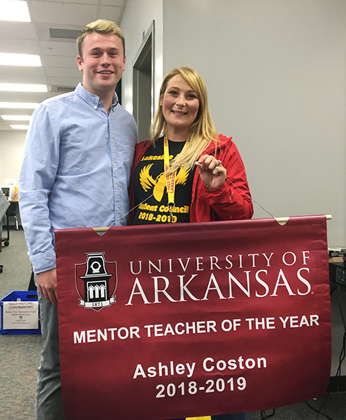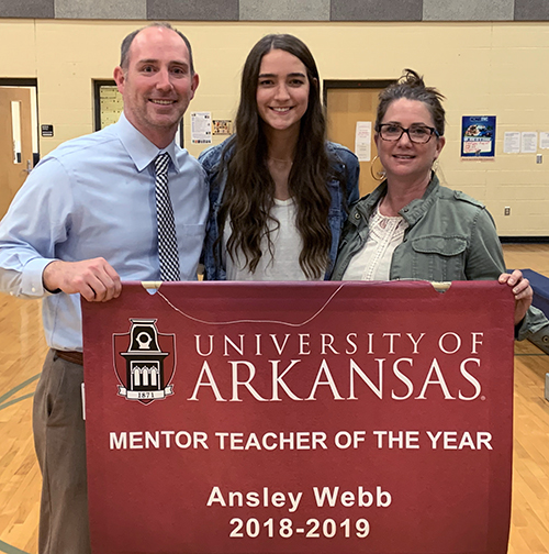 Three University of Arkansas teacher candidates recently surprised their public school mentor teachers with banners lauding them as a Mentor Teacher of the Year for 2018-19.