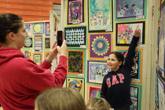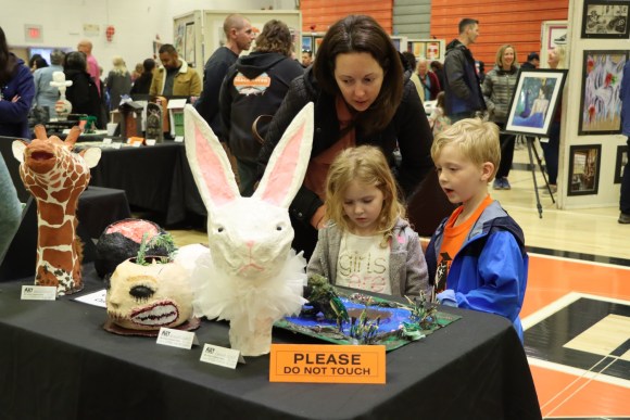 The gym was packed with artwork made by kids in kindergarten through twelfth school, including complex sculptures, delicate pottery, and paintings and drawings.