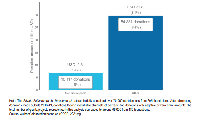 Philanthropy carries a congenial potential of eliciting positive financing from private foundations and not-for-profit organisations for addressing the challenges of meeting the sustainable development goals. Given their roots are based on the ethics of doing overall societal good, philanthropy can explore the dynamics of grant funding towards specific goals, targets and projects. There is a shift observed in recent years towards flexible financing for building trust not only amongst the beneficiaries but also for general support for the sector. Though infrequent, flexible financing is gathering momentum among the philanthropes. For example, about 16 percent of their overall donations between 2016-2019 were tuned flexibly to tackle the urgent needs of the society. Further, based on historical data from 20 large international philanthropic donors, the OECD report detected a recent upward trend towards more flexible giving, peaking at 20 percent of yearly giving in 2021 on an average. Figure 3 illustrates the state of flexible financing as per an OECD study conducted in 2021. Out of 64,948 grants or projects selected, only 10,117 which is US$ 6.8 billion and 16 per cent, were unearmarked or for general purposes. On the other, US$30 billion was allocated for specific projects or programmes. While around 16 percent of the grants or projects are designated as general budget support, these flexible donations account for roughly 19 per cent of the total donated.