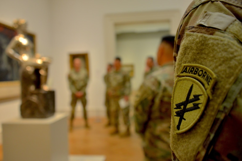 Earlier in the training day, the aspiring guardians of history networked with museum staff members and elected officials. Later, the group received a briefing on the estimated loss of cultural pieces during the Ukrainian crisis. As photos of charred buildings and damaged infrastructures were shown, the soldiers better understood how impactful conflict can be on a people’s identity.