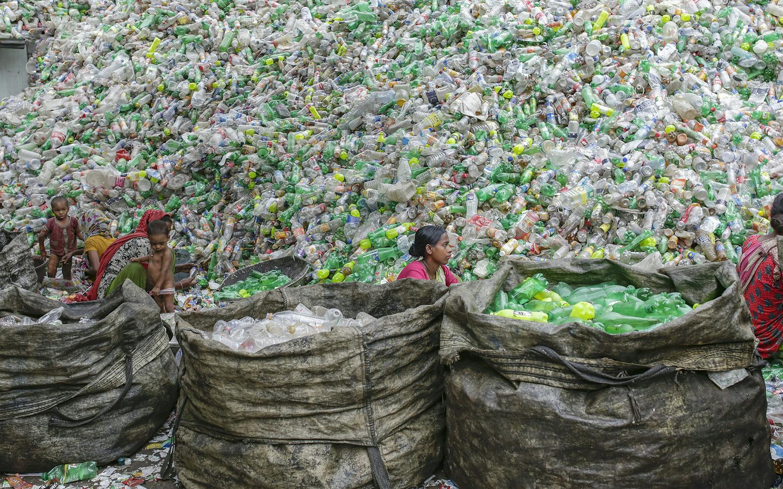Female workers sort out plastic bottles for recycling in a factory in Dhaka, Bangladesh. If plastic production stays on its current trajectory, by 2030, greenhouse gas emissions from plastic could reach 1.34 billion tons per year. Photo: Abir Abdullah/Climate Visuals