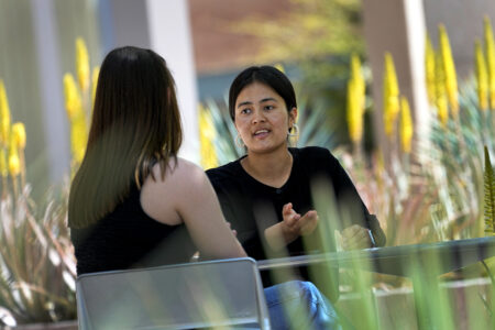 Fahima Sultani talks with a classmate at Arizona State University, Friday, April 7, 2023, in Tempe, Ariz. Sultani and others tried for days in the summer of 2021 to get into the Kabul airport, only to be turned away by the gun-wielding extremists as the Taliban swept back into power. After a harrowing escape, Sultani is one of more than 60 Afghan women who arrived at ASU in December 2021. (AP Photo/Matt York)