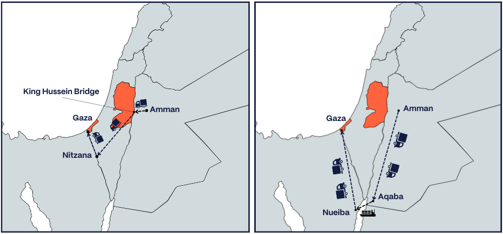 The complications in Egypt pushed UN agencies and humanitarian organizations to look for other alternatives, including via Jordan. Prior to the current war, Jordan maintained a regular trucking route for commercial goods delivered to Gaza, which included a rigorous vetting and inspection process allowing for ease of delivery. This system could be scaled to expand the delivery of both UN humanitarian assistance and commercial deliveries to offset the crisis. However, aid provided from Jordan has also been subject to extensive uncertainty as a result of coordination challenges with COGAT.