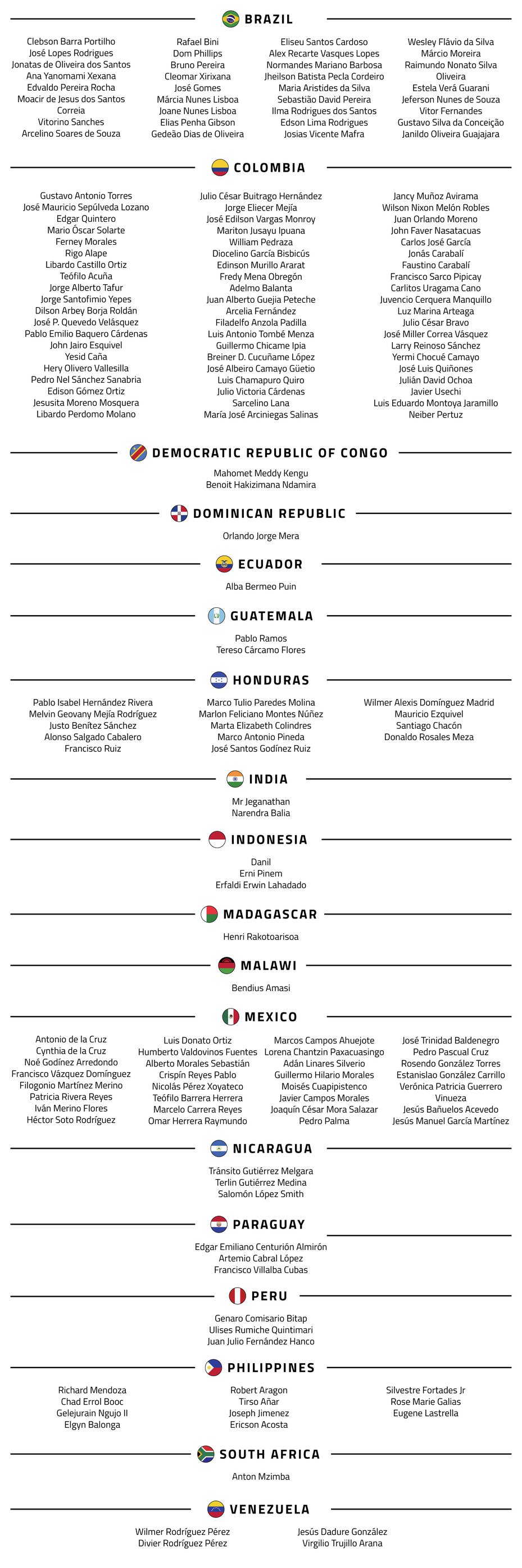 Those murdered in 2022 also include state officials, demonstrators, park rangers, lawyers and journalists. All of them shared a commitment to defend their rights and keep the planet healthy. All of them paid for their courage and commitment with their lives.