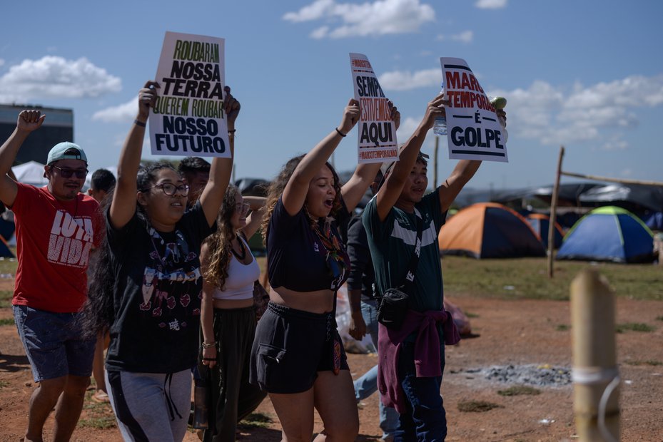 Young Indigenous activists protest against legal loopholes that could enable the theft of Indigenous lands by big business emboldened under the anti-environment administration of President Jair Bolsonaro. Karina Iliescu/Global Witness