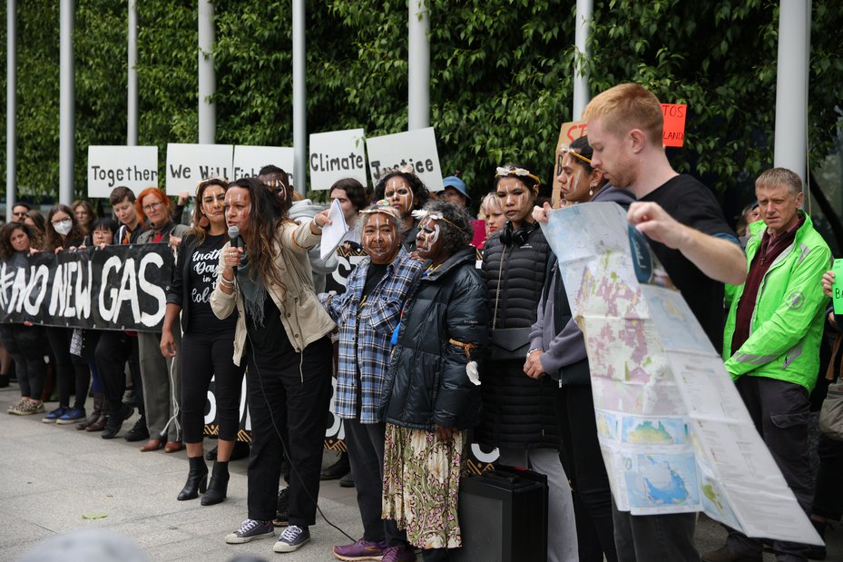 Members of the Munupi clan from Tiwi Island address the media and crowd at the front of the Federal court of Australia, in 2022. Tamati Smith/Getty Images