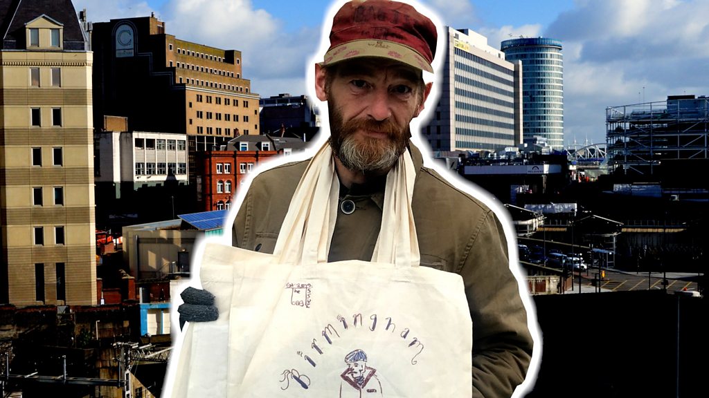 Kev draws his designs on to the bags and sells them on the city centre’s streets, asking for a small donation in return.