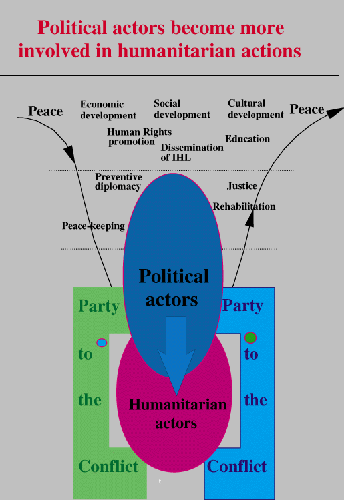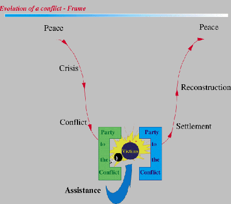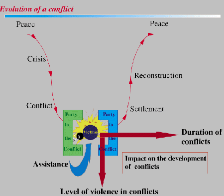 Very briefly, we can trace the theoretical development of an armed conflict using a curve that passes through a series of different stages: stable situation (peace), cri sis, armed conflict, conflict settlement, reconstruction and, finally, return to a stable situation. In between are many intermediary stages peculiar to the development of each individual conflict. Our aim here is not to study this development but rather to establish a framework within which we can study the extent to which humanitarian aid influences the dynamic of armed conflict.
