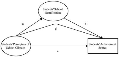 Accordingly, the current research proposes that after controlling for demographic factors, students’ school identification will mediate the impact of student’s school climate perception on academic achievement. More specifically, corresponding to Figure 1, positive school climate perception will predict stronger school identification among students (a) that in turn predict higher achievement scores (b). The indirect path from school climate to student achievement scores via school identification will be positive and significant (d).