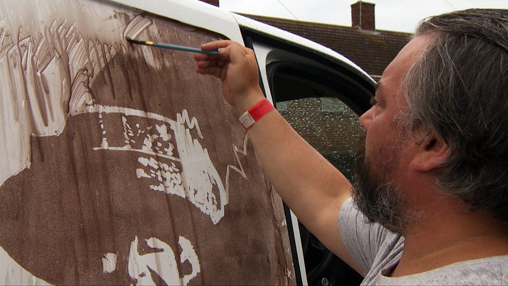 Rick Minns, aka Ruddy Muddy, covers the side of his van in specially prepared mud and uses it as a giant canvas for his drawings.