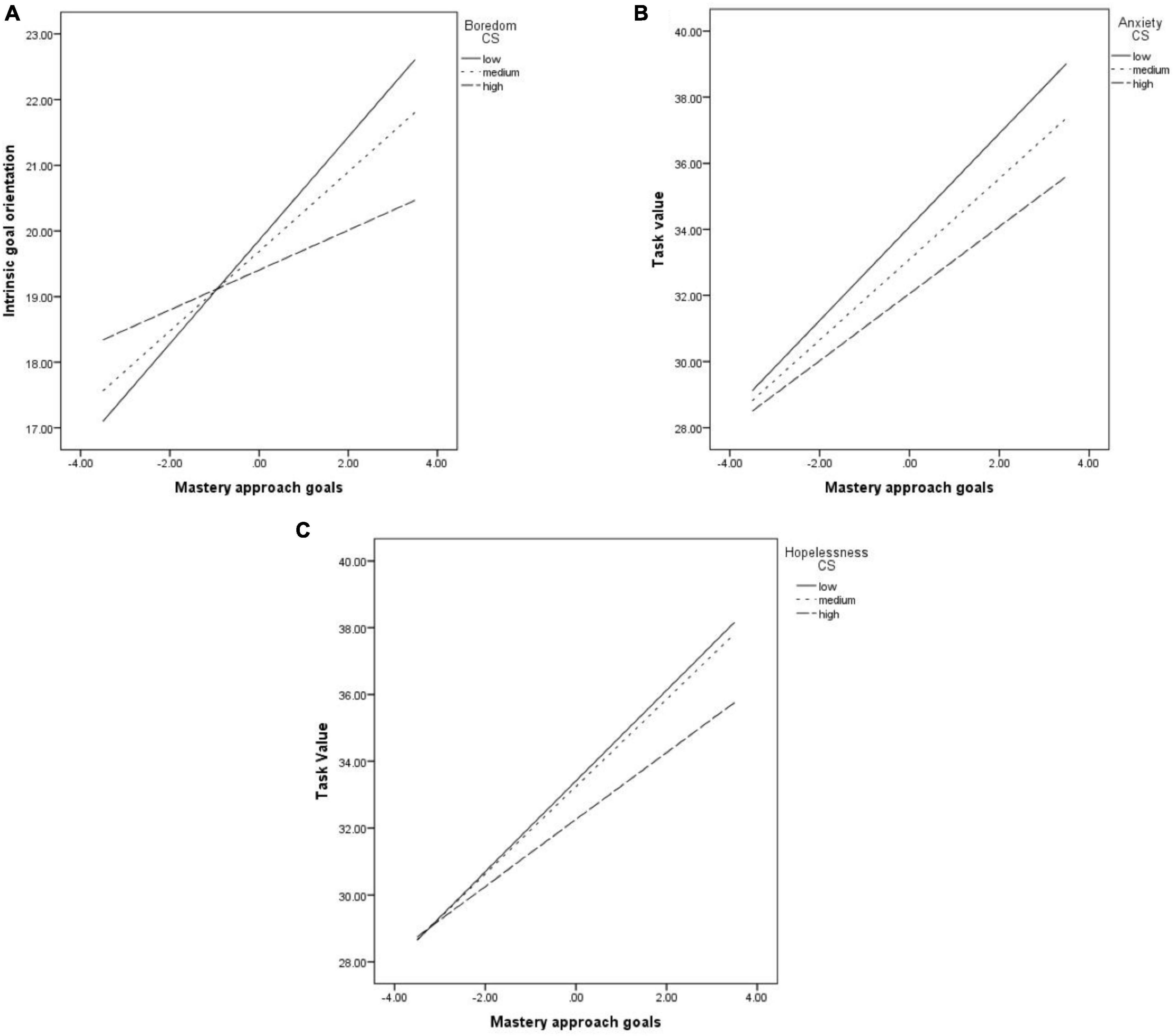 Figure 1. The relationship between MAV and: IGO, moderated boredom (A); task value, moderated by anxiety (B); task value, moderated by hopelessness (C).