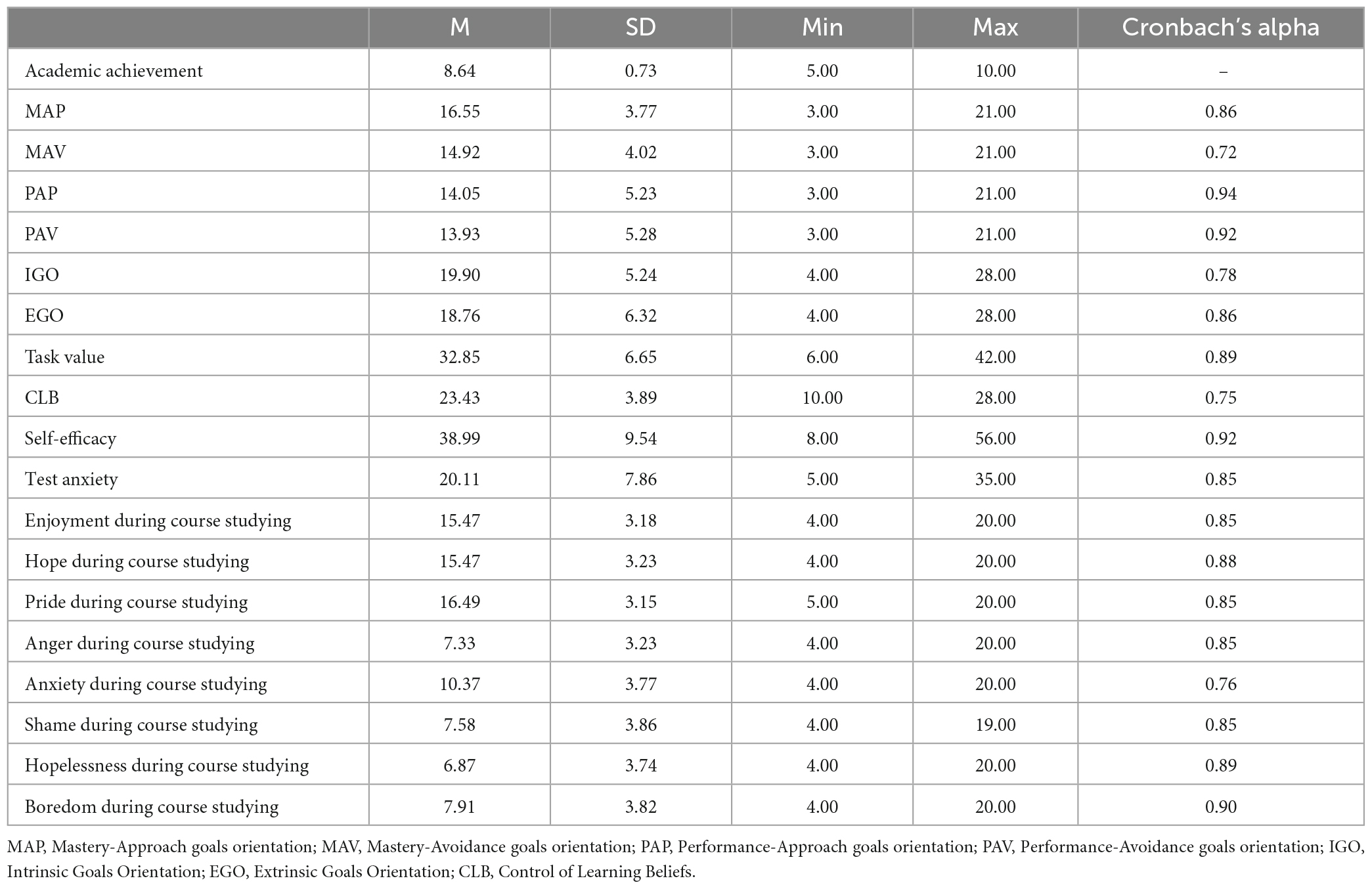 Motivational components presented above were linked to both academic achievement and goal orientation. Previous studies identified positive correlations between self-efficacy, intrinsic goals orientation and academic achievement (Kosnin, 2007; Kitsantas et al., 2008; Al Khatib, 2010; Trautner and Schwinger, 2020). The link between goal orientation and different motivational components also received strong support. Mastery-approach goals were related to intrinsic motivation, due to the students’ positive attitude and higher level of engagement in academic tasks (Elliot, 2005; Kaplan and Maehr, 2007), while performance-avoidance goals were associated to lower intrinsic motivational orientation (Shi, 2021). Other studies indicate that mastery and performance-approach goals are positively related to the task value (Church et al., 2001; Harackiewicz et al., 2002) and both mastery and performance-avoidance goals were positively related to test anxiety (Palos et al., 2019). In a meta-analysis, Payne et al. (2007) found that mastery-approach goals were associated with high self-efficacy, compared to performance-avoidance goals and that mastery-approach goals were related to lower test anxiety compared to performance-approach and avoidance goals. Shi (2021) also found that self-efficacy was positively correlated with mastery-approach goal orientation and negatively with performance-avoidance goals, but no significant relationship was found between self-efficacy and performance-approach goal orientation.