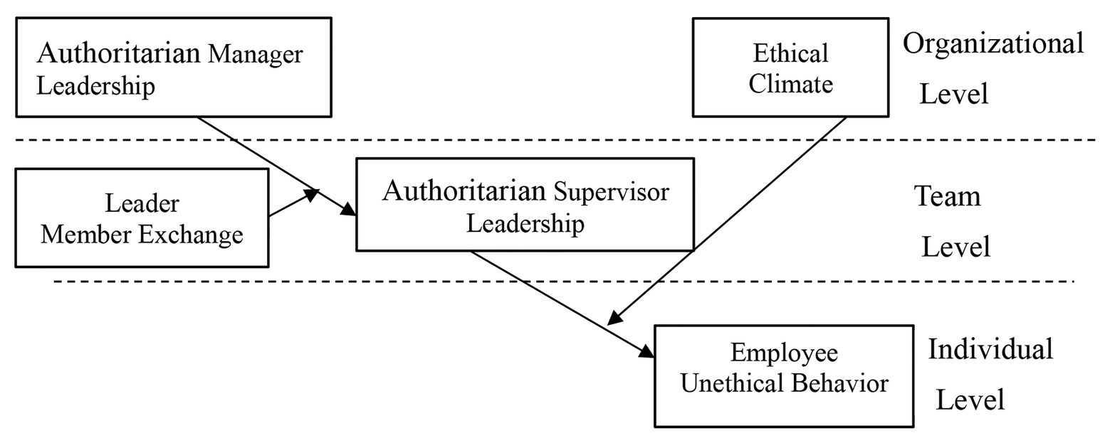 An organizational ethical climate is the wider perception of ethical standards by employees within an organization and the ethics of managers, which involves punishment for violations of the system (Schwepker, 2001). This common perception is formed by the members of an organization as to what ethical behaviors are and how to address them. The ethical climate in different organizations and departments can be strong or weak (Victor and Cullen, 1988). There are five types of organizational ethics: self-interested, caring, rules-based, legal and professional, and independent judgment (Victor and Cullen, 1988). According to social exchange theory, LMX based on respect and trust often produces long-term reciprocal relationships based on emotion. In the context of highly caring organizational ethics, because of the love and care of the organization or its members, employees put collective interests first when making choices out of gratitude and avoid unethical behavior that damages the collective interest. In an ethical climate with a high emphasis on rules and regulations, the organization requires employees to follow the rules and regulations and industry norms, i.e., the conduct of the organization and its members is strictly governed by such rules and regulations. Under such strong rules and regulations, employees also minimize unethical behavior that violates organizational rules and regulations to avoid punishment. In highly legal and code-of-conduct-oriented organizational ethical climates, social and industrial laws and codes of practice impose strong constraints on employees, meaning that they avoid unethical behavior that violates laws and codes of conduct. Therefore, a positive organizational ethical climate can help authoritarian leadership reduce unethical behaviors in employees. In a negative organizational ethical climate, employees will ignore the collective interest, rules, regulations, social laws, and professional codes. When supervisors use authoritarian leadership, unethical employee behavior will increase, and the relationship between authoritarian supervisor leadership and unethical employee behavior will become stronger. Therefore, we propose the following:
