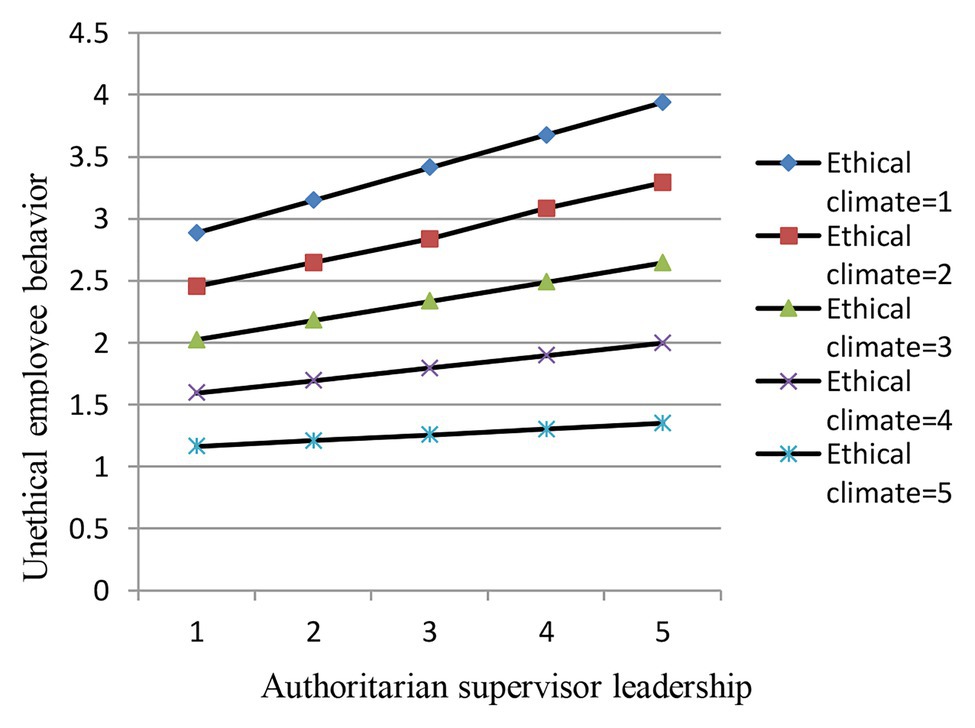 Hypothesis 5: An ethical climate negatively moderates the positive relationship between authoritarian supervisor leadership and unethical employee behavior. That is, the higher the level of ethical climate, the weaker the positive correlation between authoritarian leadership behavior and supervisors, and unethical behavior in employees.